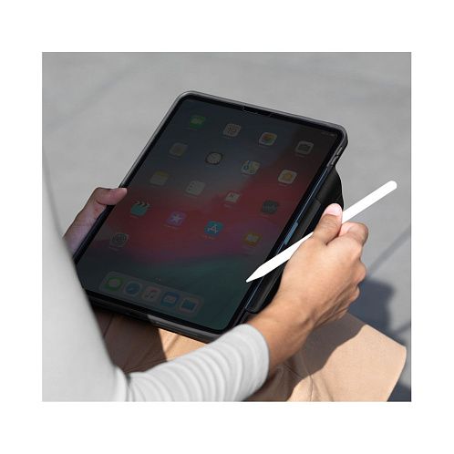 Тонкий защитный чехол Ryze 360 изготовлен из приятной на ощупь искусственной кожи. Продуманная складная конструкция дает возможность просмотра iPad на трёх различных вариантах высоты. Специальный магнитный диск позволяет вращать планшет на 360 градусов для выбора оптимального положения. Противоскользящая внутренняя подкладка помогает фиксировать устройство под разными углами. Благодаря встроенному держателю для хранения и зарядки Apple Pencil стилус всегда будет под надежной защитой и не потеряется. Встроенные в обложку магниты предотвратят случайные открытия и обеспечат включение/выключение планшета при открывании чехла (активация sleep-функции). Заглушки, интегрированные в чехол, защищают клавиши устройства от попадания грязи, пыли и воды.