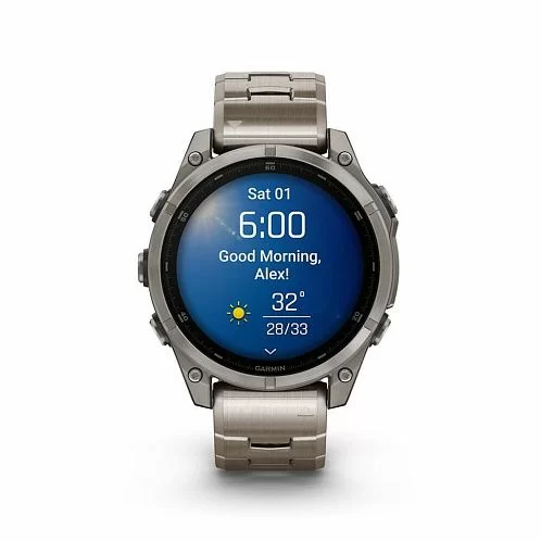Garmin Fenix 8 — умные часы в титановом корпусе с поддержкой датчиков мониторинга здоровья, совместимы со смартфонами на ОС Android и iOS. Могут принимать звонки и сообщения. Есть функция голосового управления. С часами можно нырять в воду на глубину до 100 м.- Поддержка Android и iOS.
