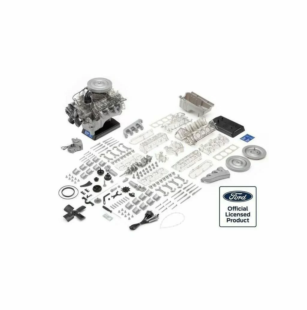 Более 200 компонентов показывают структуру и работу двигателя большого объема в мельчайших подробностях. И все работает по нажатию кнопки: зажигание искры, поршни движутся вверх и вниз вбок. При нажатии кнопки раздается классический мощный звук V8, от которого до сих пор бегут мурашки по коже. Официальное лицензирование Ford Motor Company гарантирует техническую и историческую корректность.