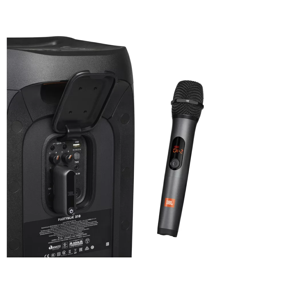Используйте беспроводные микрофоны JBL с колонкой с входом для микрофона. Но для оптимальной работы добавьте любую колонку JBL PartyBox.