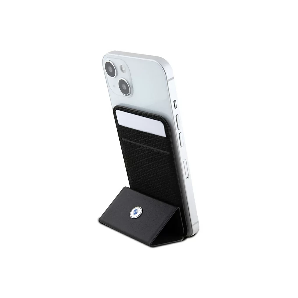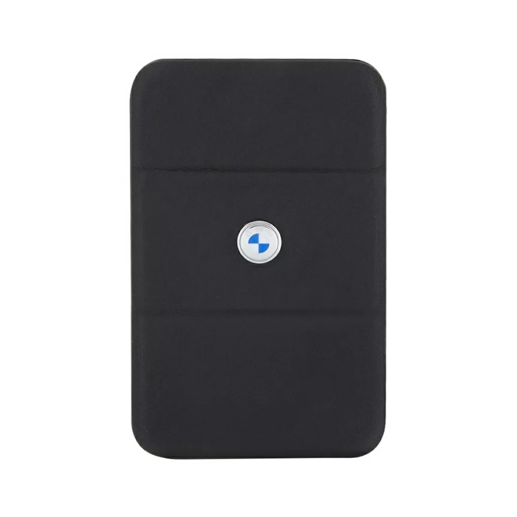 Бумажник BMW Magsafe Wallet поддерживает крепление Apple Magsafe. Инновационное решение позволяет легко и надежно присоединить аксессуар к задней панели вашего смартфона или установить на защитный чехол, который поставляется с магнитным кольцом MagSafe. Картхолдер изготовлен из качественной натуральной кожи, имеет отделение с магнитным клапаном для хранения одной или двух пластиковых карт. Внутренние стороны покрыты микрофиброй. Декорирован металлическим логотипом бренда. Аксессуар также можно использовать в качестве подставки.