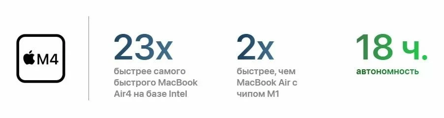 Молниеносная производительность для ИИ. Благодаря улучшенному Neural Engine в чипе M4, MacBook Air предлагает мощные возможности искусственного интеллекта, которые значительно повышают вашу продуктивность. От автоматического центрирования камеры до масштабирования изображений с помощью ИИ и работы с новейшими языковыми моделями — вы будете более эффективны и креативны, чем когда-либо.