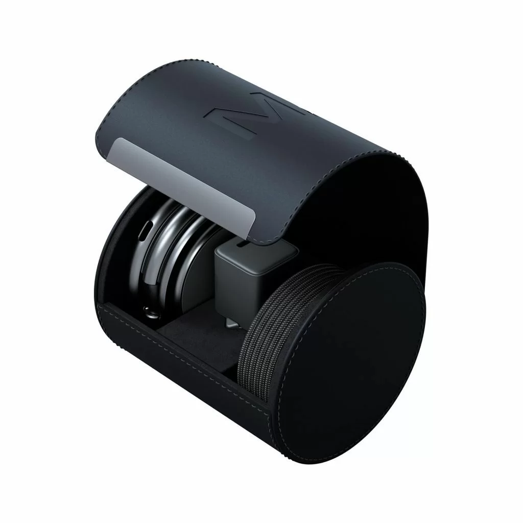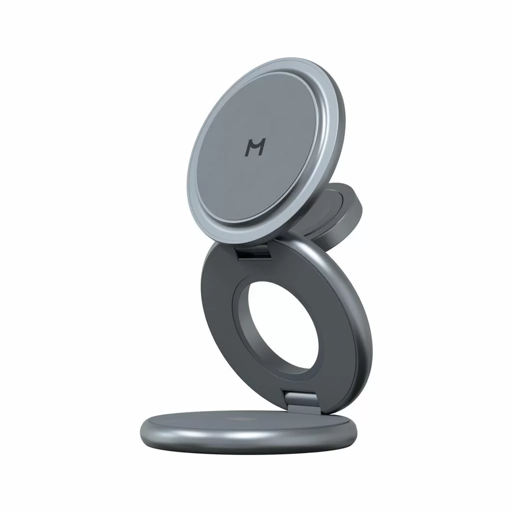 Корпус выполнен из прочного цинкового сплава с матовым покрытием и встроенными магнитами класса N52, которые надёжно удерживают устройства. Конструкция складывается в три сегмента, что делает зарядку максимально компактной и удобной в дороге. В комплекте предусмотрен кожаный кейс, идеально подходящий для переноски и защиты.