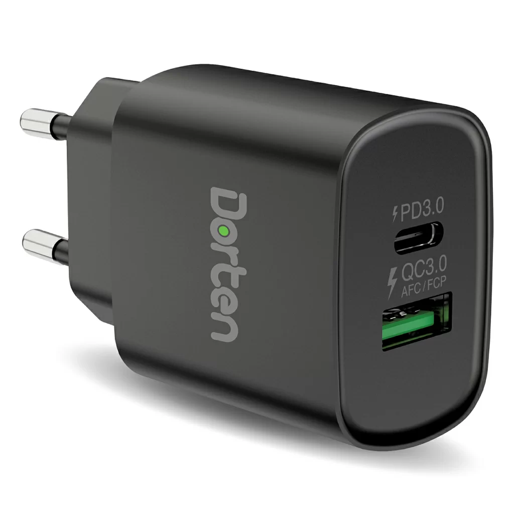 Блок питания Dorten позволяет заряжать устройства с помощью портов USB-C и USB-A. Оба порта соединены с внутренним чипсетом, который автоматически определяет подключенное устройство, чтобы обеспечить нужное количество энергии для оптимальной зарядки. USB-C мощностью 20 Вт с технологией PD3.0 обеспечивает быструю зарядку вашего смартфона Айфон / планшета Apple (до 50% емкости аккумулятора можно зарядить в течение 30 минут), в то время как 18-ваттный порт USB-A, поддерживающий Qualcomm ™ 3.0, FCP ™ и AFC ™ одновременно, так же обеспечивает быструю зарядку вашего смартфона / планшета (в течение 20 минут можно зарядить до 50% емкости аккумулятора).