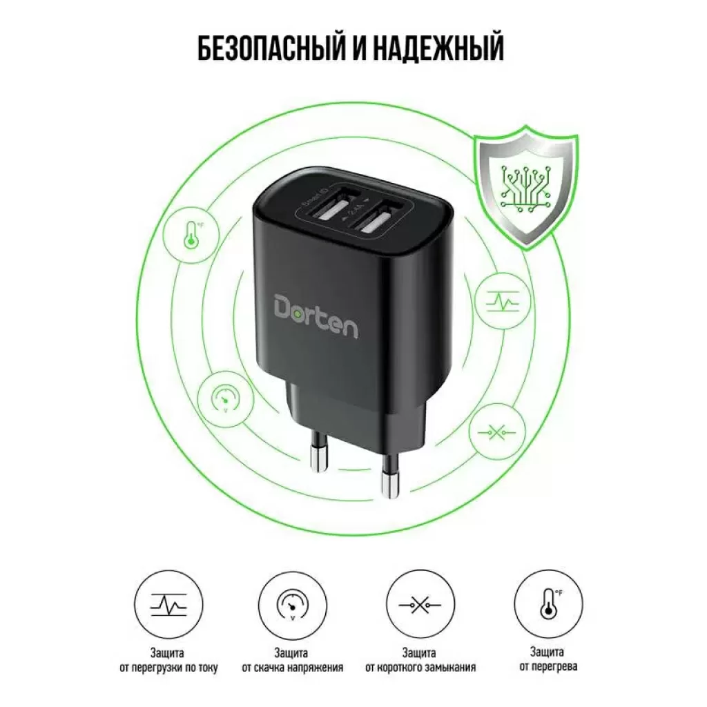 Сетевое зарядное устройство Dorten 2-Port USB Smart ID 12W Wall QC 2.4A, черный