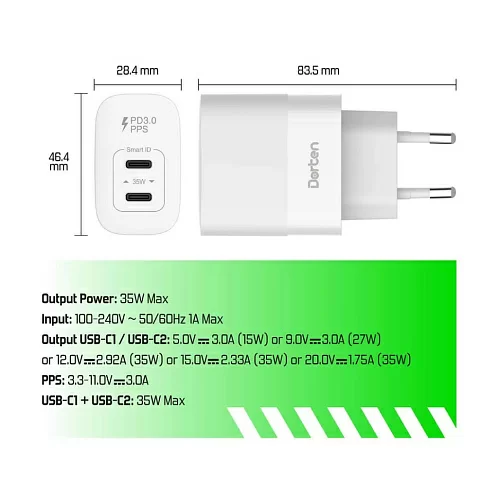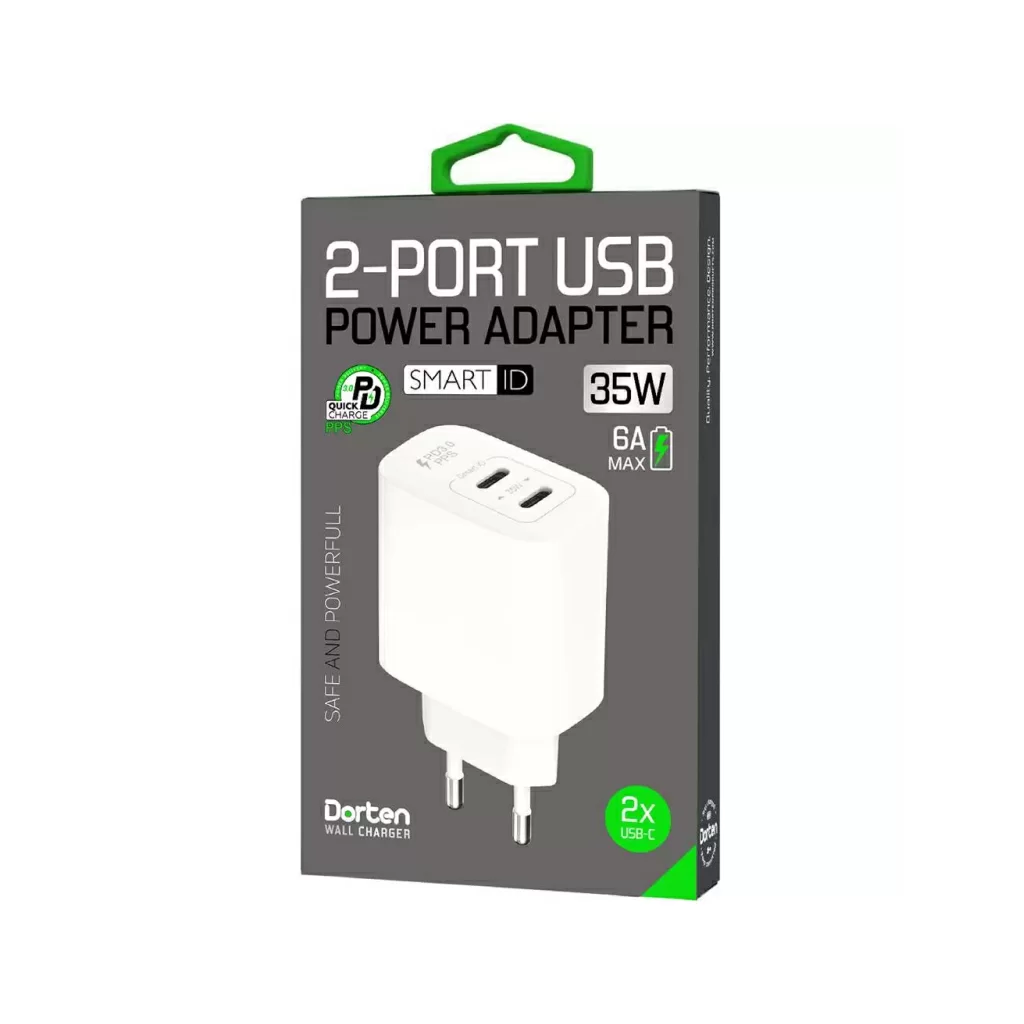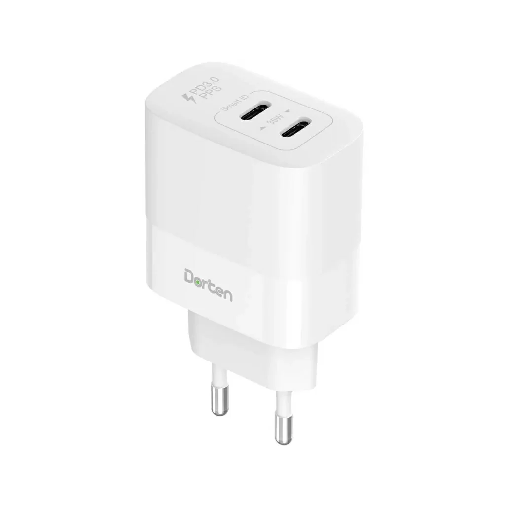 Сетевое зарядное устройство Dorten 35W с двумя портами USB-C и поддержкой технологии PD - это универсальный зарядник для ваших гаджетов. Заряжайте сразу два устройства, будь то ноутбук, планшет или смартфон, используя два порта USB-C.