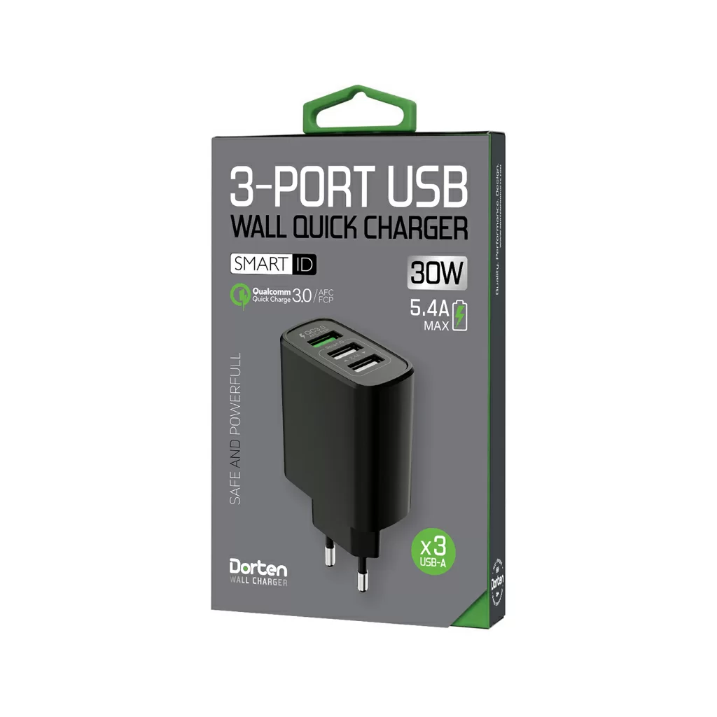 Dorten 3-Port USB Smart ID 30W Wall Quick Charger: QC3.0+2.4A