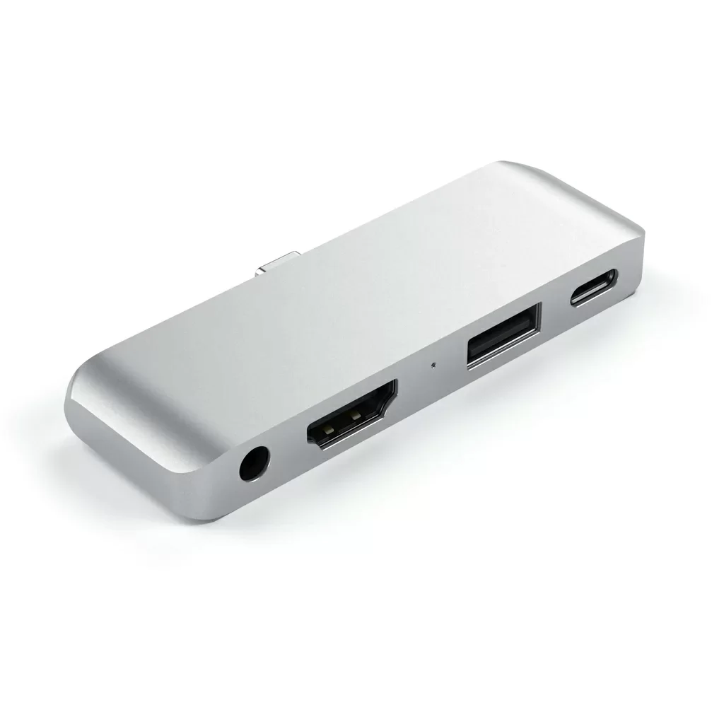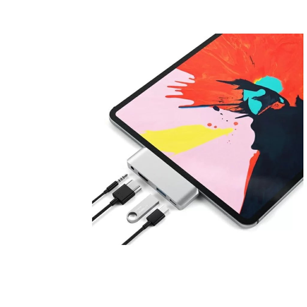 Satechi Aluminum Type-C Mobile Pro Hub, созданный специально для iPad Pro 12.9” (3-го поколения) и iPad Pro 11”, облегчает доступ к периферийным устройствам. Он преобразует единственное соединение USB-C в порты HDMI 4K 30Гц (ограничение для iPad Pro – 2K 60Гц), USB-C PD 3.0 для зарядки, USB 3.0 (до 5 Гбит/с) и аудиоразъём 3.5 мм.