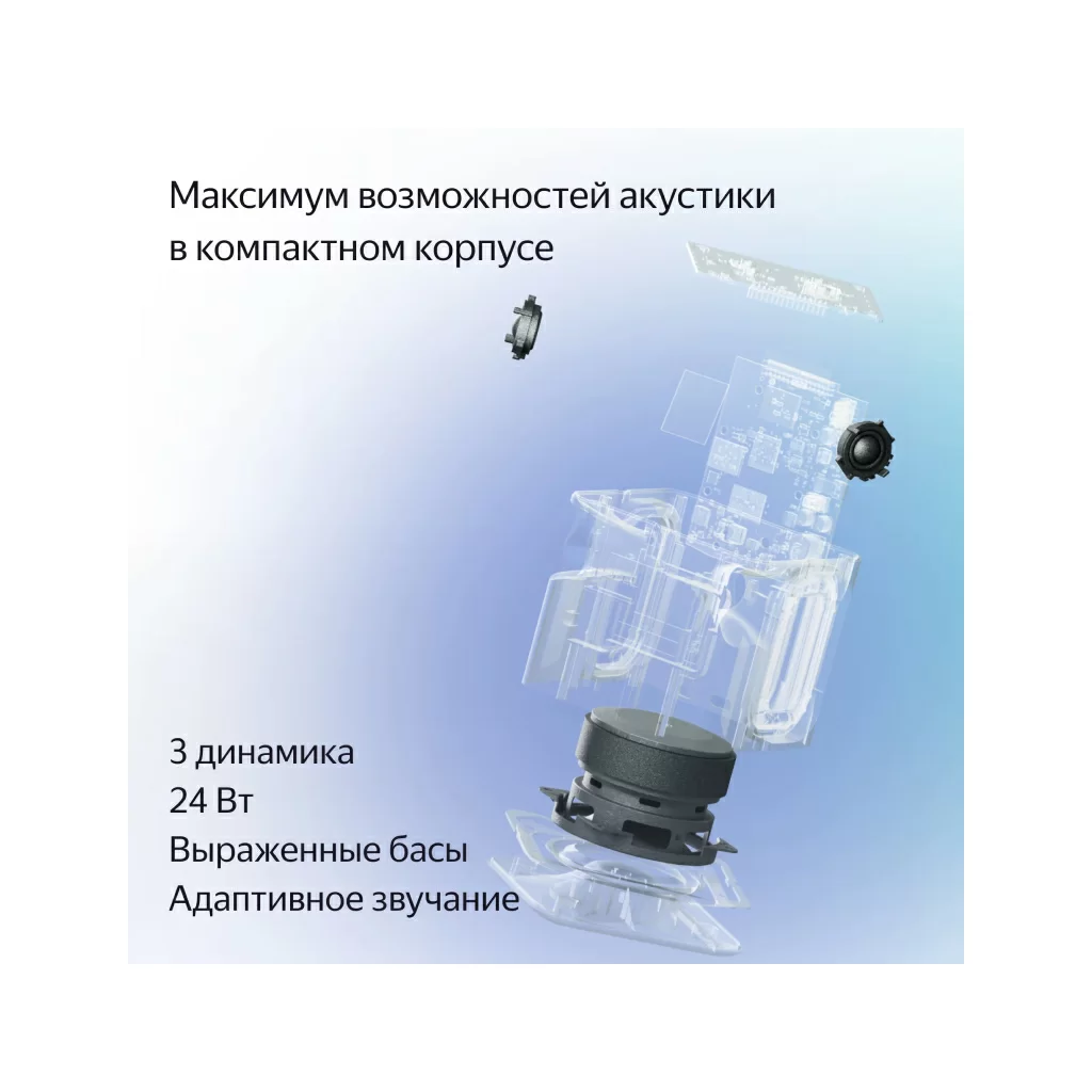Технология Room Correction адаптирует звучание под форму и размер комнаты — ставьте Станцию Миди куда угодно, и звук подстроится. Мощность 24 Вт.
